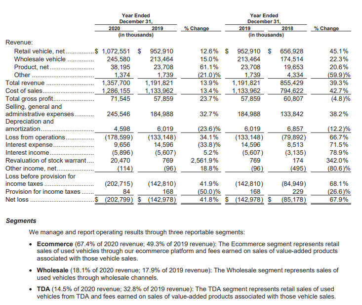 브이룸의 비지니스모델 중 3가지 매출 : Ecommerce (이커머스 판매) 67.4 % / Wholesale (이커머스 판매 등급 미만의 차를 딜러에게 판매) 18.1% / TDA (현장 판매 및 리컨디셔닝) 14.5% 발생했다. 이 중 Ecommerce 매출이을 살펴보면 2020년 코로나로 이커머스 매출 2배 가까이 급상승하였다.