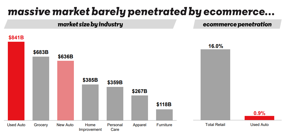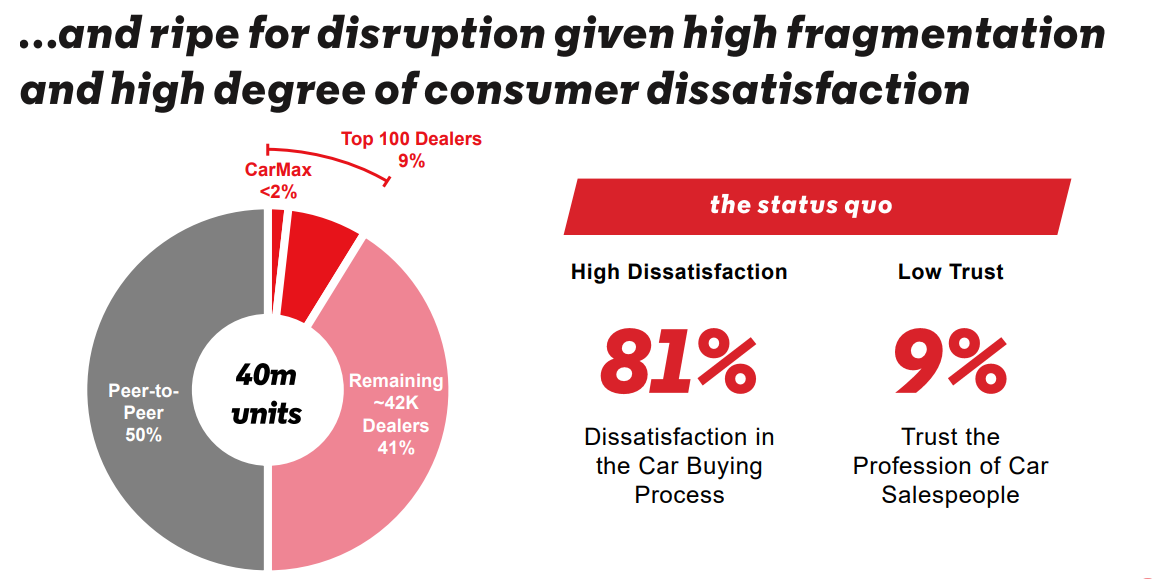 현재 미국에는 42,000개가 넘는 중고차 딜러십이 존재하고 상위 100개의 중고차 소매업체의 시장 점유율은 9%에 불과하다. 심지어 미국 내 가장 큰 가장 큰 딜러 브랜드인 CARMAX도 미국 시장의 2% 미만인 1.9%을 차지하고 있을 정도이다.