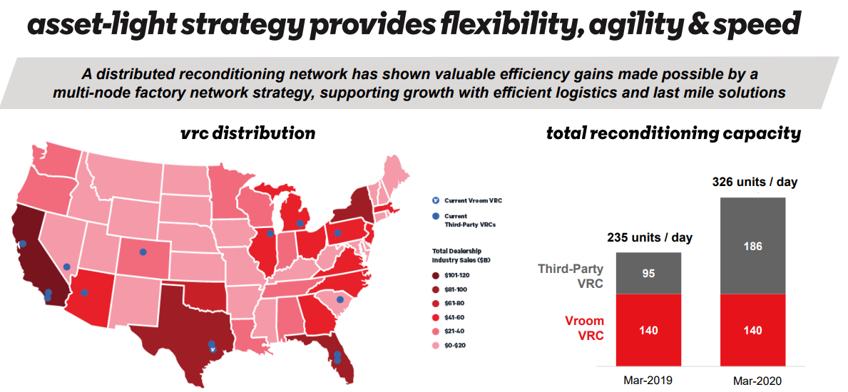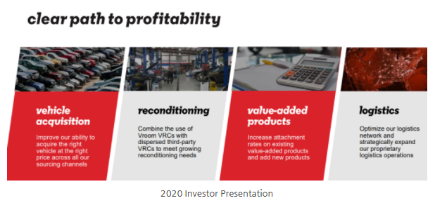 2. VEHICLE OPERATIONS : Vroom은 경매, 소비자, 렌터카 회사 및 딜러로부터 전략적으로 재고를 소싱 후 VROOM의 자체 수리소를 통해 VROOM의 품질 표준을 충족하도록 수리되고 플랫폼에 리스트 하여 판매한다. 모든 소싱 채널에서 향상된 공급 데이터를 통해 수요가 많은 차량을 획득하는 기술을 향상하고 소비자 소싱을 촉진하기 위해 마케팅에 힘쓰고 있다.