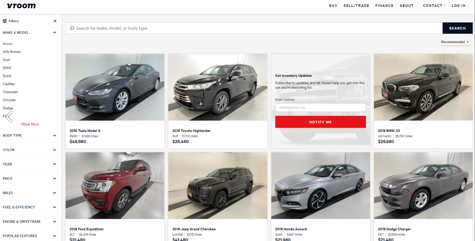 Vroom은 더 나은 구매 방법과 더 나은 중고차 판매 방법을 제공하여 중고차 산업을 변화시키는 혁신적인 End-To-End 중고차 전자 상거래 플랫폼이다. Vroom은 국가적 규모로 업계의 지속적인 변화를 주도하고 있으며 차량의 검색에서 배송, 그리고 그 사이의 모든 단계에 이르기까지 차량 구매 및 판매 프로세스의 모든 단계가 통합된 방식이다.