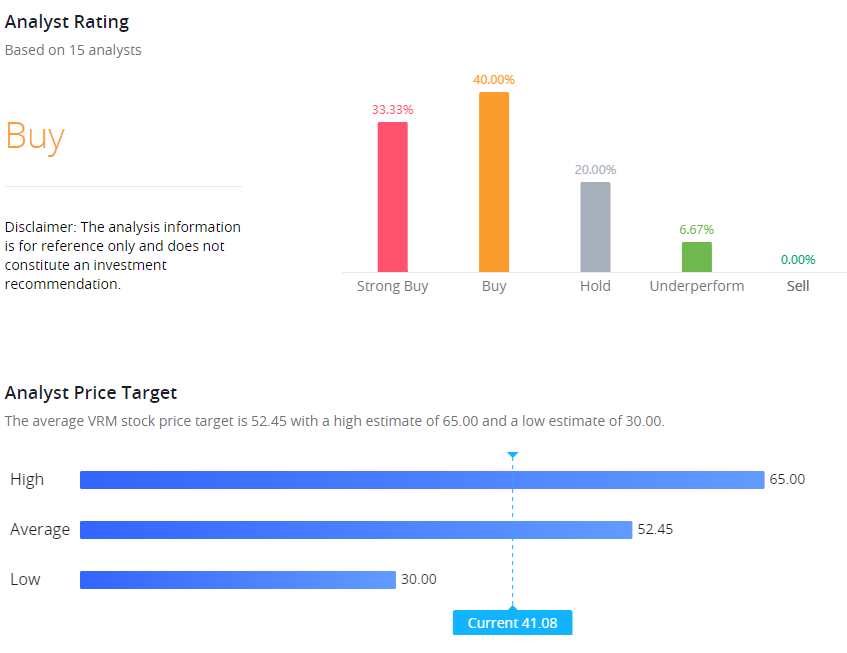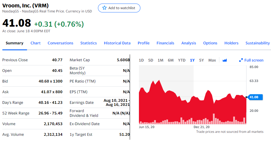 '브이룸(VROOM, VRM)'의 주가는 6월 18일 종가 기준 41.08 달러이다.