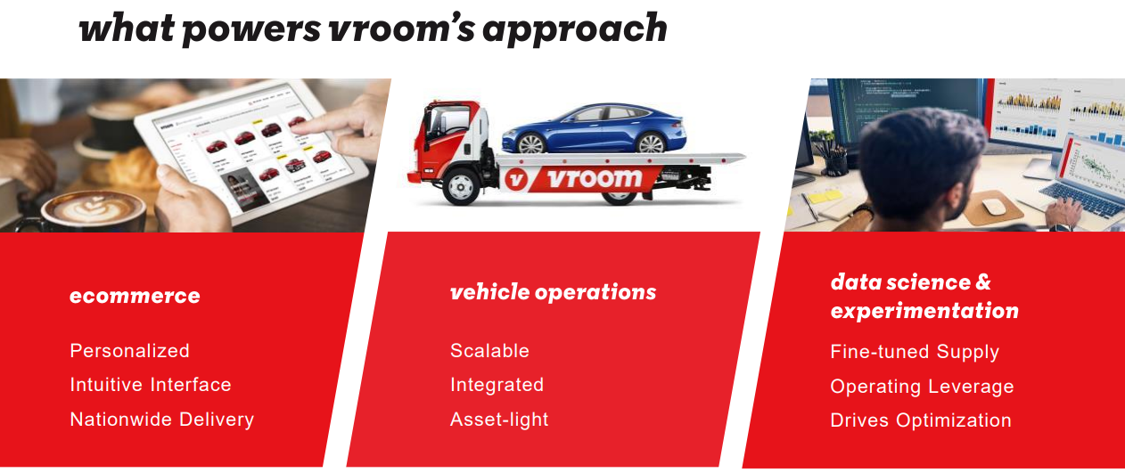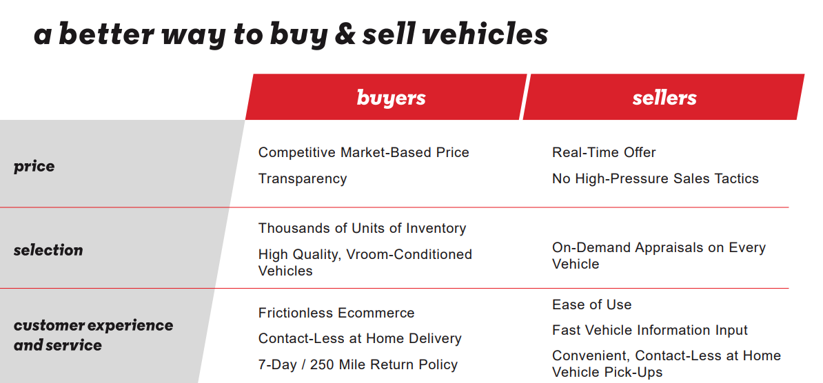 VROOM은 구매자와 판매자에게 투명성있게 경쟁력 있는 가격을 실시간으로 제시하고 구매자에게 선택 가능한 수천 개의 양질의 차량을 보유하고 있으며 판매자에게 모든 차량의 On-Demand(주문형 서비스, 찾아가는 서비스) Appraisals(판단, 평가) 서비스를 제공한다. 온라인을 통해 편리한 비대면 배송, 픽업 서비스를 제공하며 구매자에게는 7일 이내/250마일 이내로 주행하였을 경우 무료료 환불이 가능하다.
