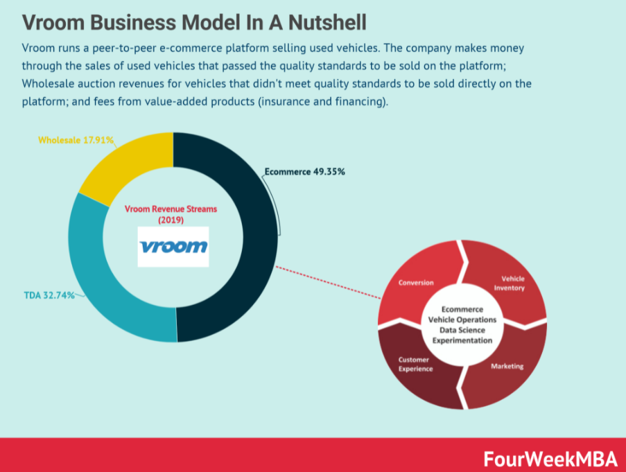 브이룸(VROOM)은 전국적으로 차량 구매, 판매, 운송, 리컨디셔닝, 가격 책정, 자금 조달, 등록 및 배송을 위한 엔드 투 엔드 전자 상거래 플랫폼을 제공한다. 브이룸 플랫폼은 고객에게 중고 차량의 품질과 일관성을 보장한다. 고객 중심 비즈니스 모델은 기존 대리점 모델과 P2P 시장의 단점을 해결할 수 있으며 고품질 및 수요가 많은 차량, 금융 서비스 및 전국 물류 네트워크 등 을 하나로 결합한 전자 상거래 플랫폼이다.
