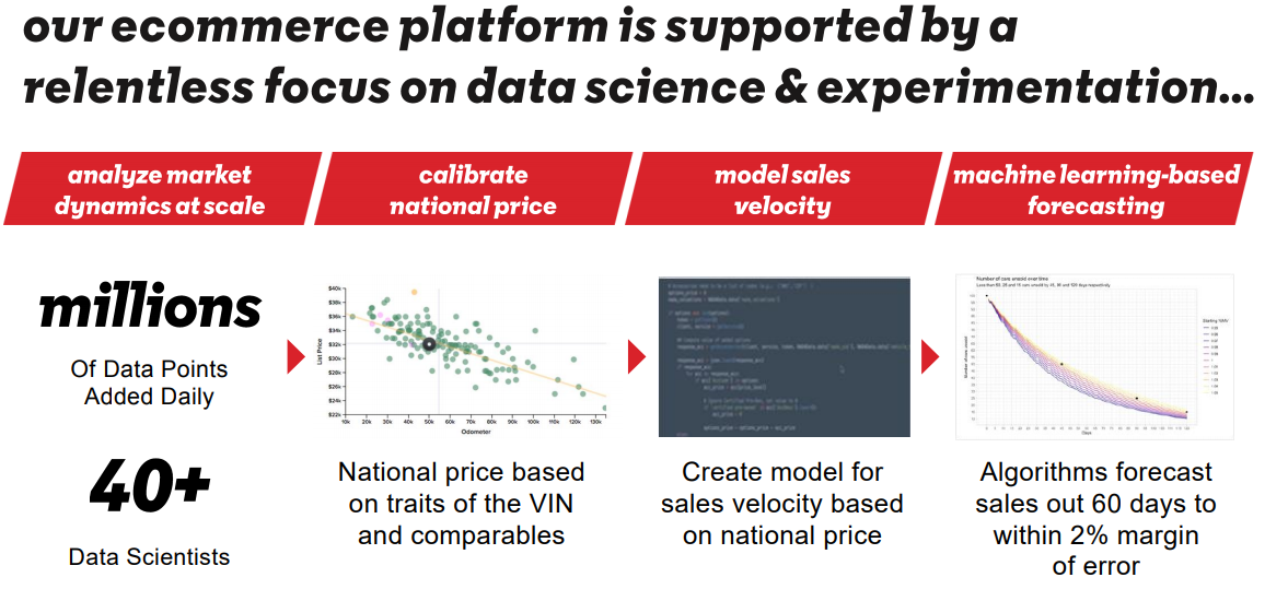 3. DATA SCIENCE & EXPERIMENTATION : CEO 및 경영진이 프라이스라인닷컴(Priceline.com), 부킹 홀딩스(Booking Holdings), 익스피디아(Expedia) 등 거대 플랫폼 출신이 많은 만큼 플랫폼의 가장 중요한 부분인 DATA SCIENCE & EXPERIMENTATION에 많은 투자와 관심을 기울이고 있다. 차량을 구매 및 판매하는 과정에서 생성된 데이터를 활용하여 기업 마케팅의 효과를 높이고, 고객 경험을 개선하고, 대규모 시장을 조사 및 분석하고, 차량 가격을 조정하는 등 고객의 요구에 최적화된 서비스 제공을 목표로 한다.