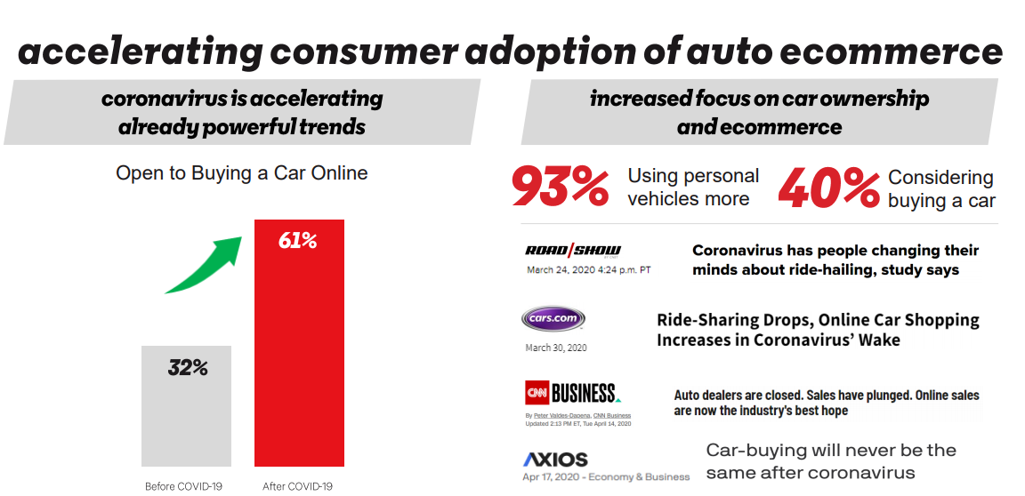 VROOM의 최근 기업 소개 자료에 의하면 COVID-19 바이러스로 인한 포스트 코로나 시대를 맞이하며 차를 온라인에서 사는 것에 대한 이커머스 트렌드가 가속화되고 있다고 한다. Cox Automotive Data 설문 조사에서 소비자의 49 %가 온라인으로 차량을 구매할 의향이 있다고 보고했으며 코로나 바이러스 이후 개인 자동차 구매를 고려하는 사람이 40%나 증가하였다고 한다.