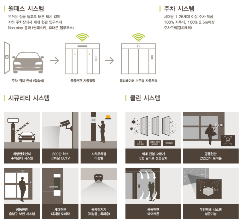 - 원패스 시스템 : 버튼 터치 없이 지하 주차장에서 세대 현관 입구까지 Non stop 통과