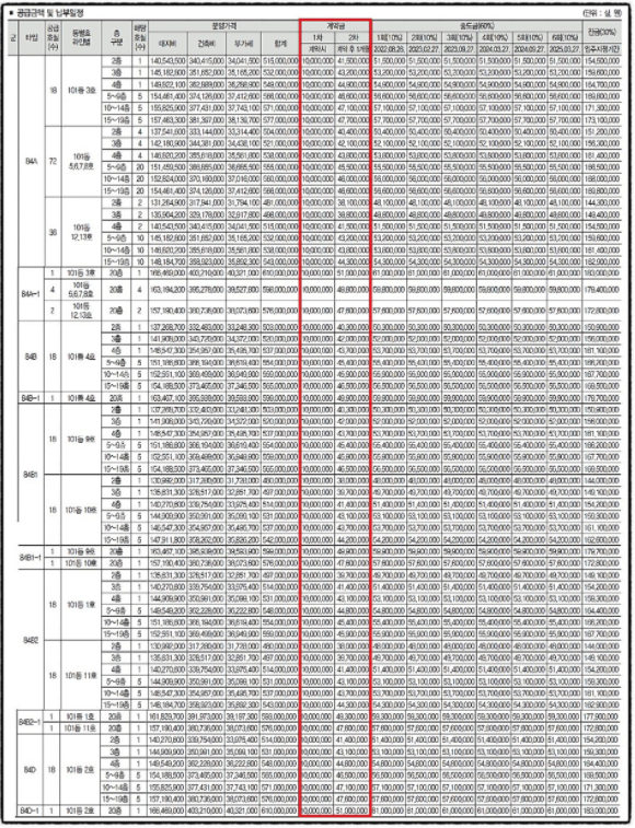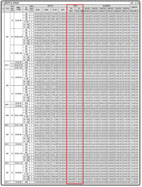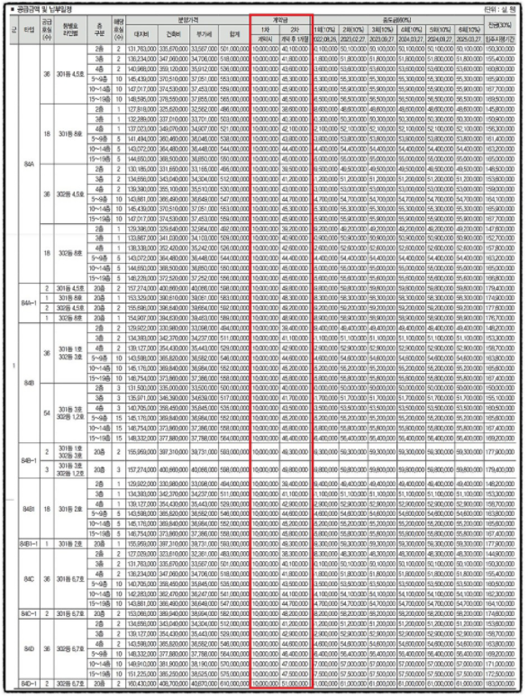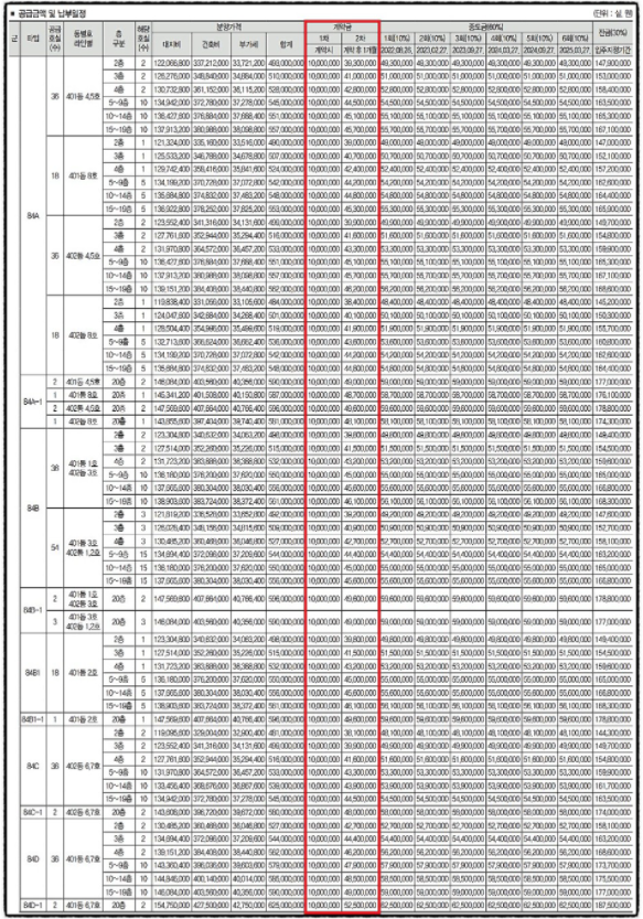 1차, 2차 계약금 금액은 총 분양금액의 10%가 되겠습니다.