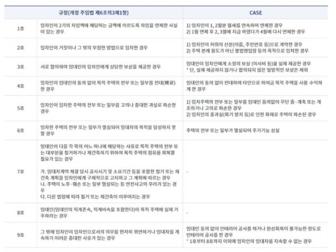 1) 1호와 같이 2기의 차임연체시 임대인은 갱신 거부 가능한데요 2개월 연속 월세 연체가 아니라 계약기간 내 2기 연체 시 갱신 거부가 가능합니다.