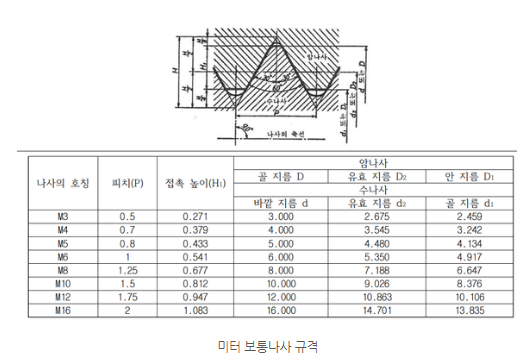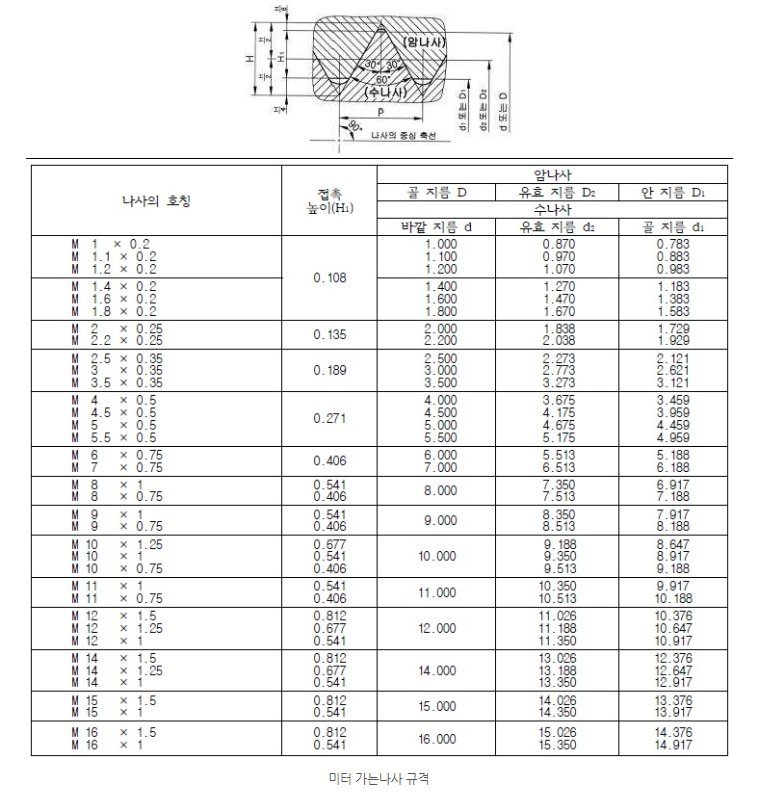 미터가는나사는 M호칭지름과 피치를 같이 표기하여 헷갈리지 않게 합니다. EX) 미터가는나사는 피치가 작아 체결력과 높은 강도를 갖습니다. 진동이 심한 나사 풀림 방지용으로 사용됩니다.