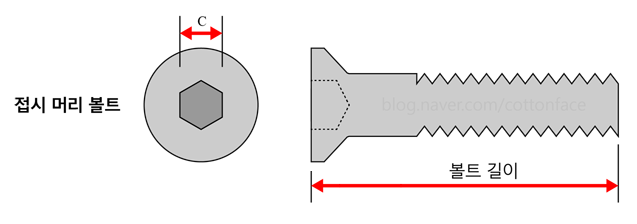 볼트의 길이 L : 볼트의 길이는 머리부터 재는 것이 아니며, 파묻히는 다리 부분만 잰다. (접시 머리 볼트는 접시 포함)