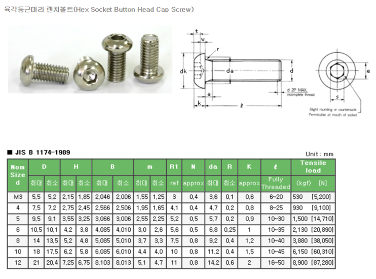 1. 육각 렌치 볼트 규격표