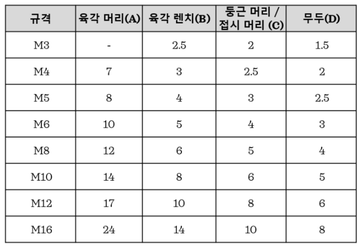 볼트의 규격별 머리 사이즈