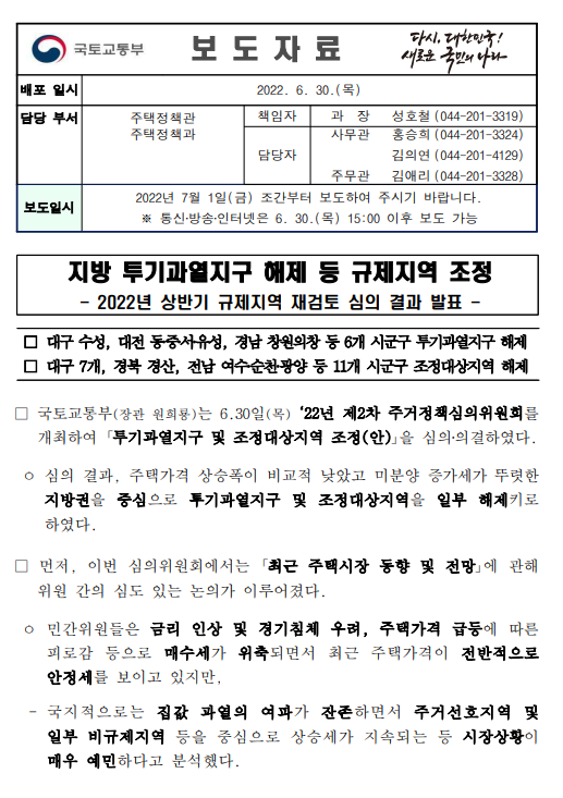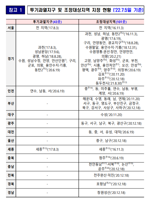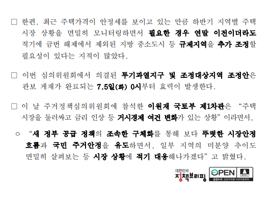 이번 심의위원회에서 의결된 투기과열지구 및 조정대상지역 조정안은 관보 게재가 완료되는 7월 5일(화) 0시부터 효력이 발생한다.