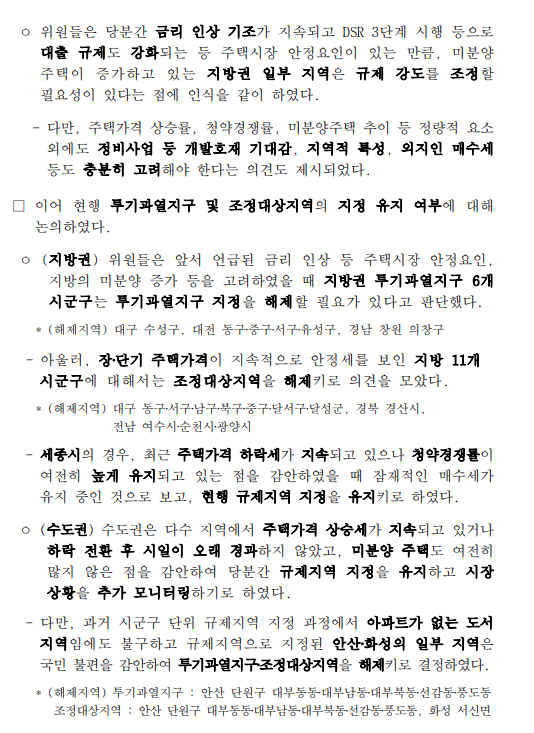 수도권은 다수 지역에서 주택 가격 상승세가 지속되고 있거나 하락 전환 후 시일이 오래 경과하지 않았고, 미분양 주택도 여전히 많지 않은 점을 감안하여 당분간 규제지역 지정을 유지하고 시장 상황을 추가 모니터링하기로 하였다.